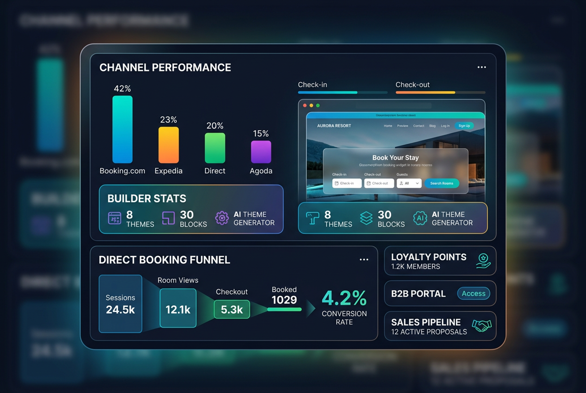 8 tema website builder, Channex kanal yönetimi, glassmorphism booking engine. B2B portal, sadakat programı ve 47 API route ile tam entegrasyon.